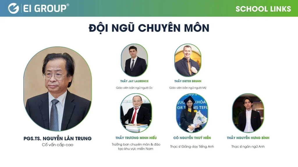 School Links được triển khai bởi đội ngũ giảng viên có trình độ chuyên môn cao, bao gồm cả giáo viên Việt Nam và giáo viên bản ngữ với kinh nghiệm giảng dạy trong môi trường học thuật và quốc tế. Tất cả giảng viên đều được tuyển chọn kỹ lưỡng, đào tạo bài bản theo khung chương trình chung và thường xuyên được cập nhật phương pháp giảng dạy hiện đại.